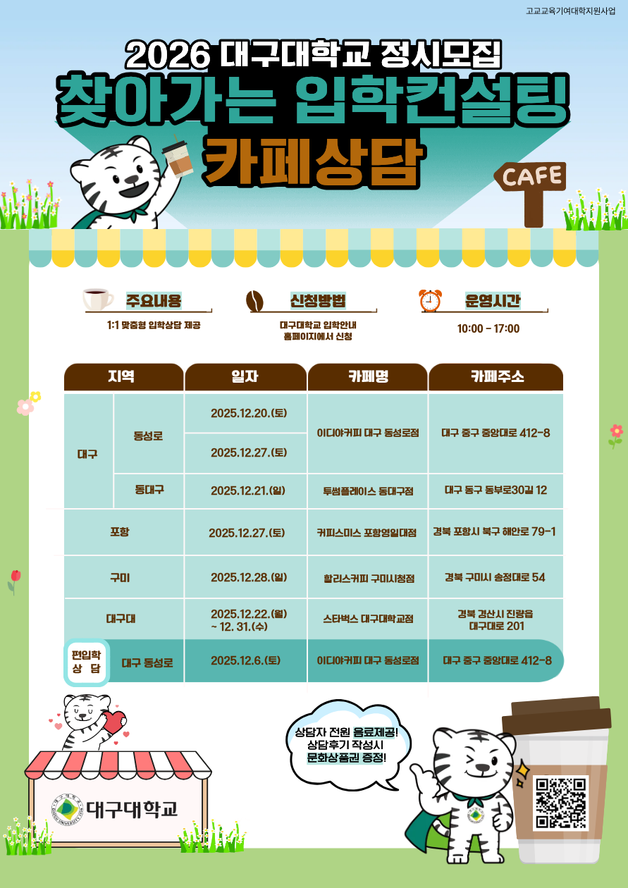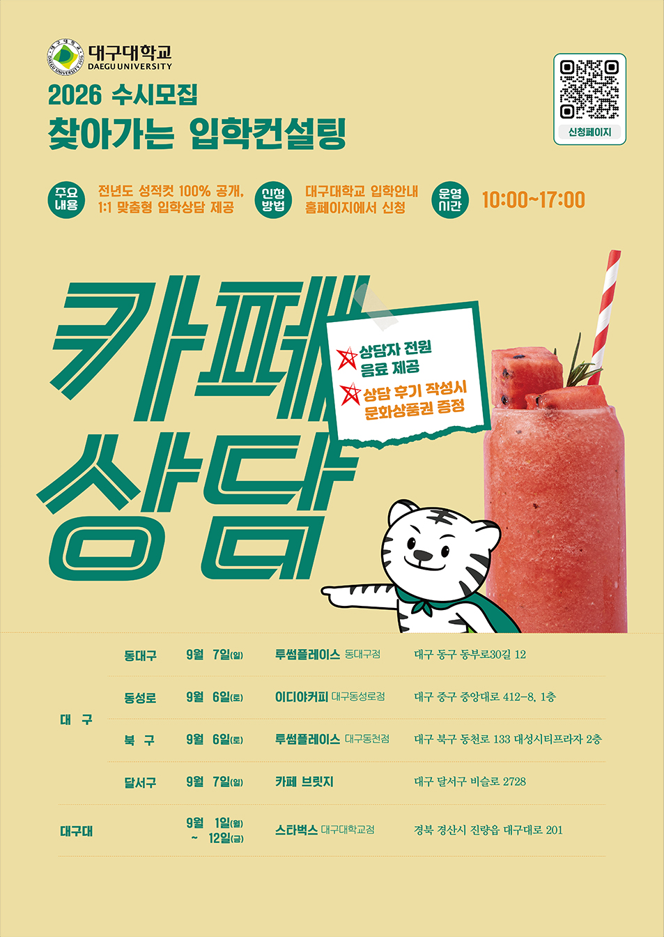 대구대학교 입학처는 본교에서 운영하는 찾아가는 입학컨설팅의 원활한 진행을 목적으로 아래와 같이 귀하의 개인정보를 수집하고자 하며, 수집된 개인정보는 2026학년도 수시모집 찾아가는 입학컨설팅 운영 및 입시정보 전달 목적으로만 사용됩니다.