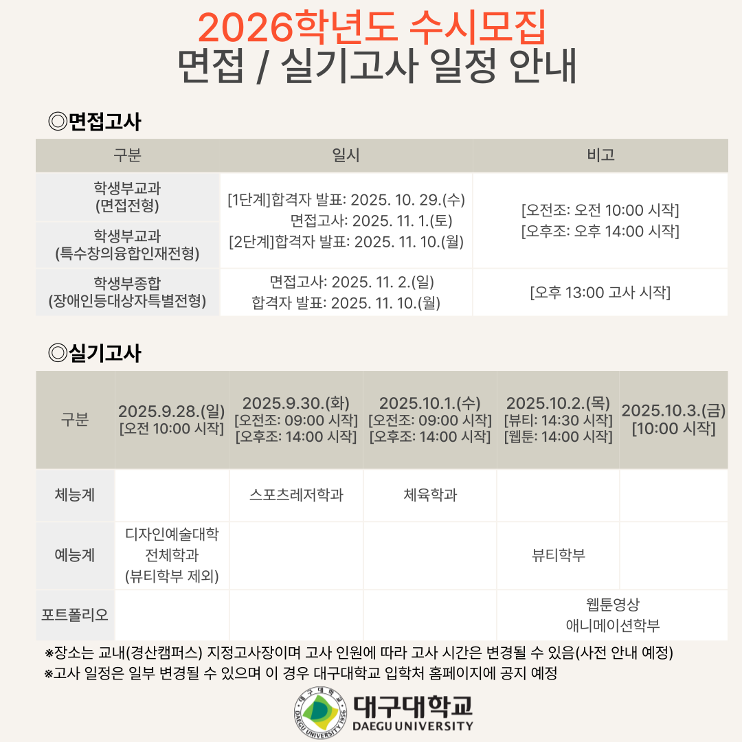 2026학년도 수시모집 면접/실기고사 일정 안내