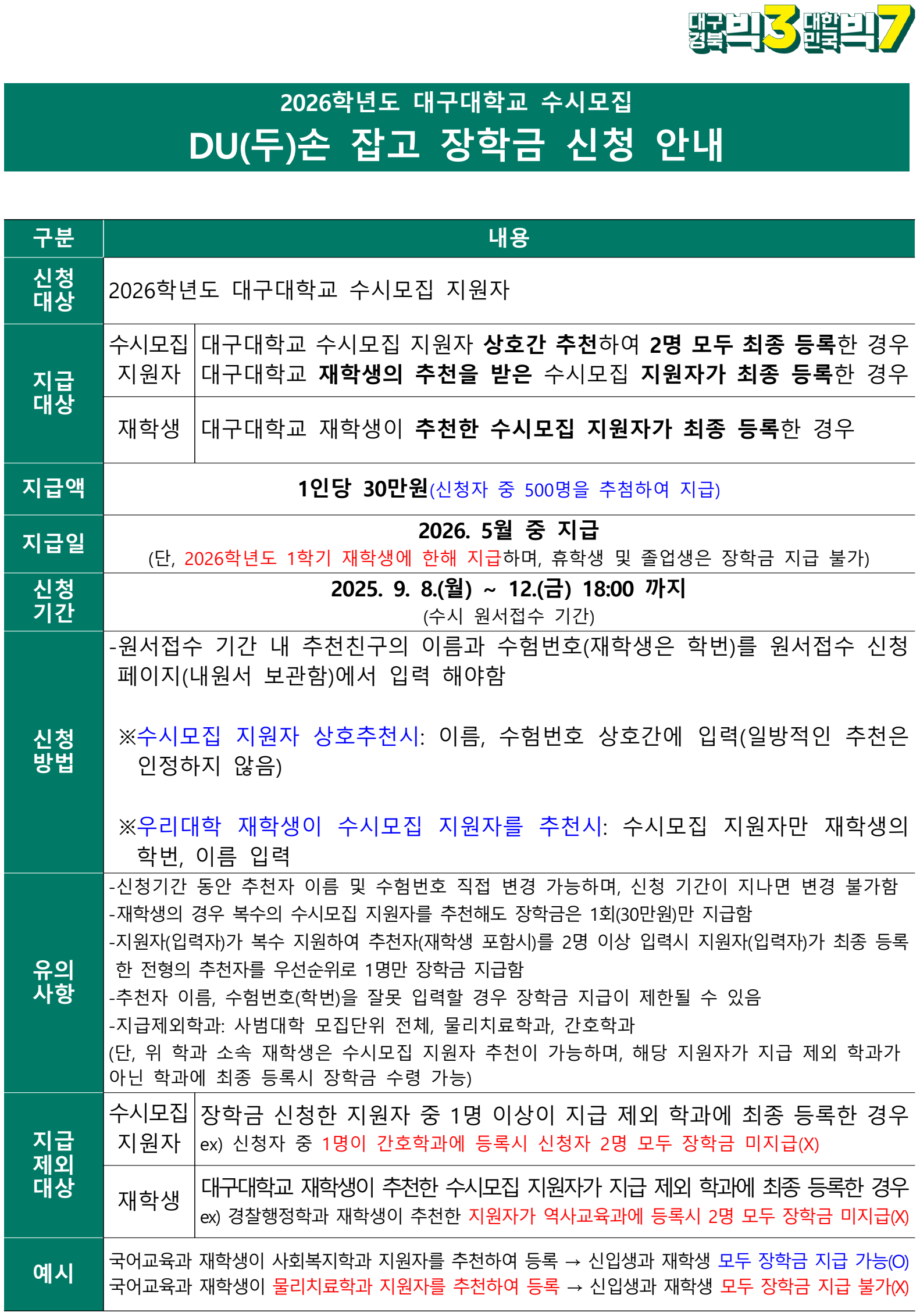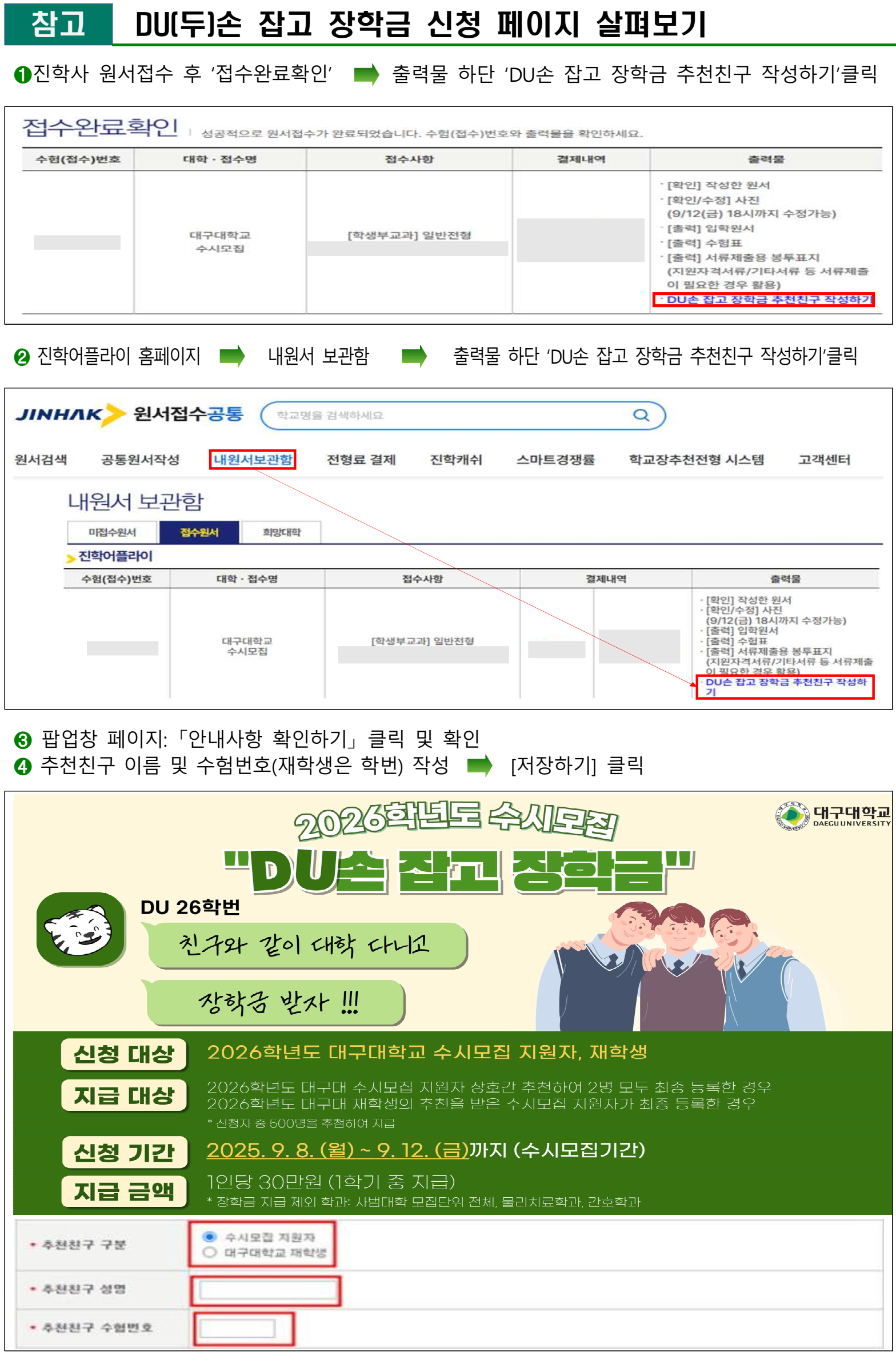 [수시] 2026 수시모집 DU(두)손 잡고 장학금 신청(친구 추천) 안내