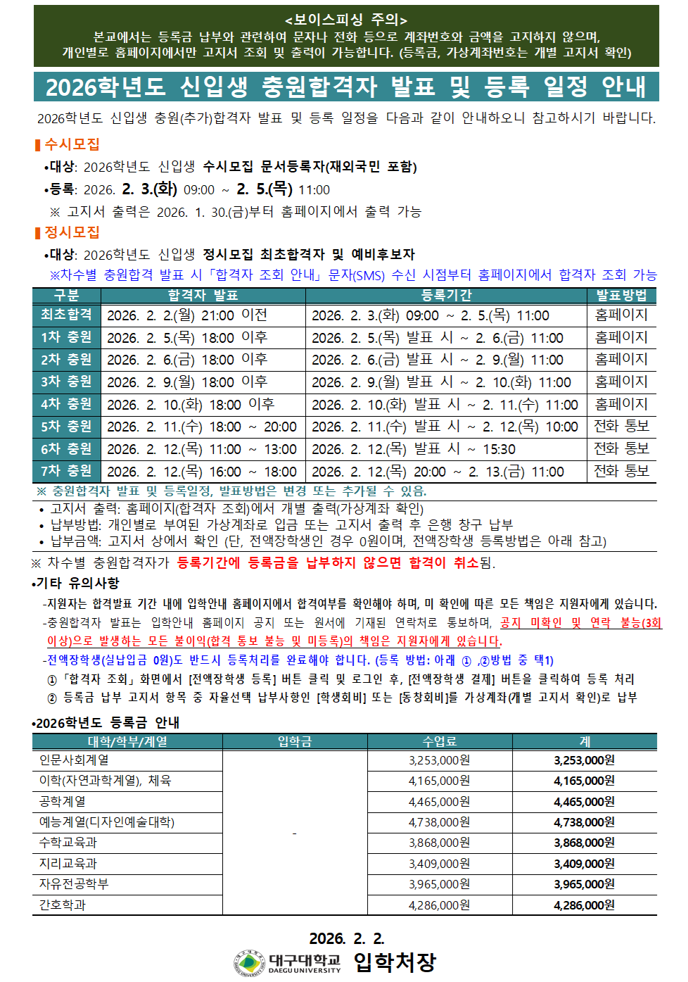 2026학년도 정시모집 신입생 충원합격자 발표/등록 일정 안내