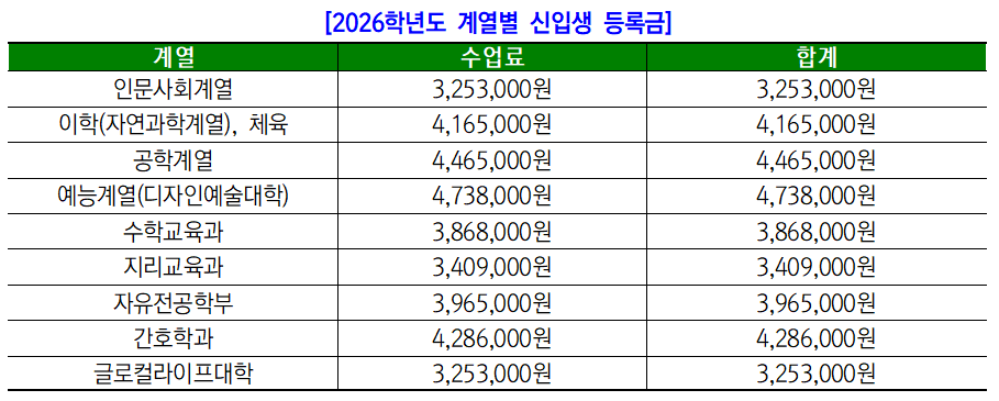 □ 2026학년도 신입생 등록금 안내