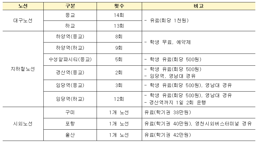 □ 통학버스 노선 및 요금(2026-1학기)