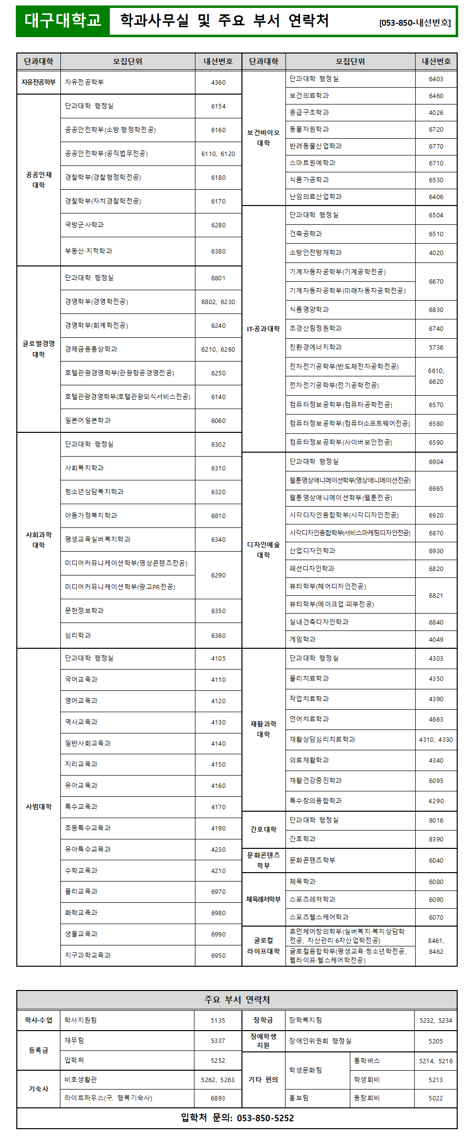 2026학년도 모집단위별 학과사무실 및 주요 부서 연락처